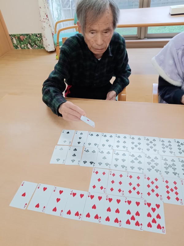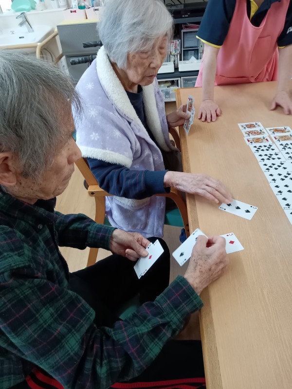昨日の七並べで大盛り上がりだったので、今日のレクもトランプゲームです! 七並べ、ババ抜きを楽しんでいるみなさんの笑顔をお届けします~