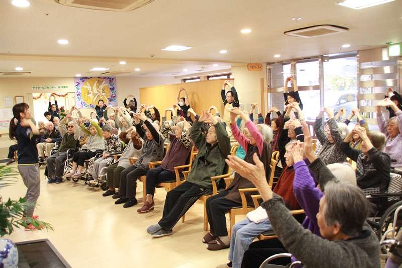 平成30年12月11日火曜日のNO~Aエクササイズ写真は、火曜日を体で表現しています。今年も12回のエクササイズが、大きな声と、大きな笑と、楽しくエクササイズを終えることができました。今回も施設の玄関ホールにて、デイサービス・ショートステイ・グループホームそして、すこや家のご利用者様が61名、他職員約10名の参加で元気よく腕を上げ足も上げたり下げたり約1時間笑顔で皆様参加されておりました。