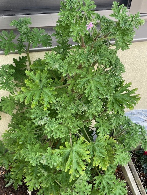 グループホームみんなの家・中野鷺宮の入り口に沢山の鉢植えがありますが、昨年春に植えたカレン草(ローズゼラニウム)が花を付けました。