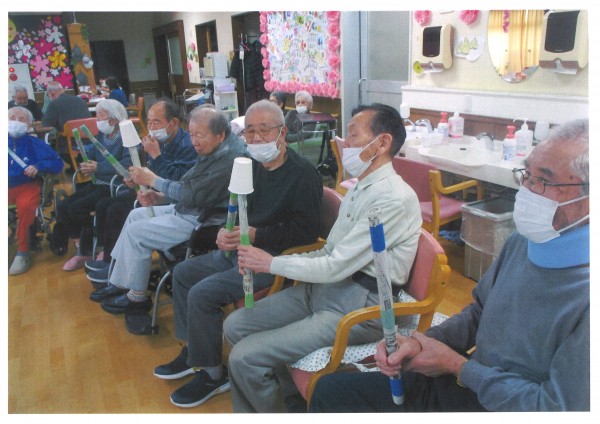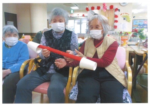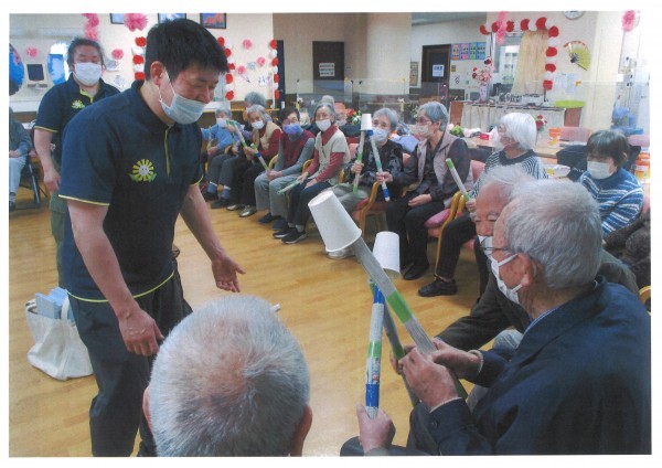 新聞紙で作った棒を使い、紙コップをお隣にリレーのように送っていくゲームです。力加減が難しく「あ、落ちちゃった!」という声もちらほら。でも、次第にコツをつかみ、見事なリレーが完成しました。