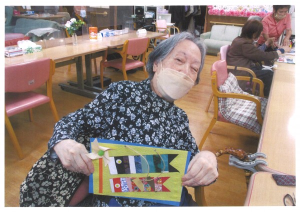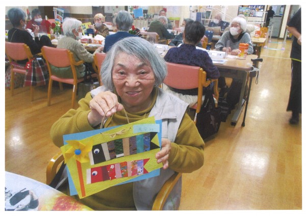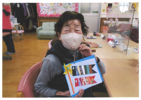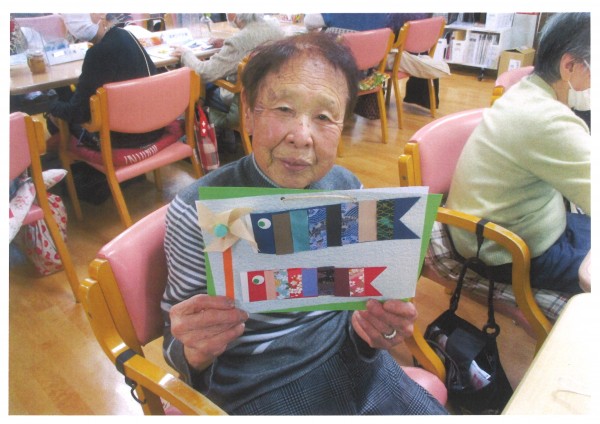 材料は職員がすべて用意し袋に入れて一人分をセットしてあります。その袋を開けて数がきちんと入っているか確認し、手順通りに作っていきます。皆様職員の説明を熱心に聞きながら丁寧に作られていらっしゃいました。様々な和紙の模様が美しい鯉のぼりの飾りが完成し、最後はご自分の作品と一緒に記念撮影しました♪