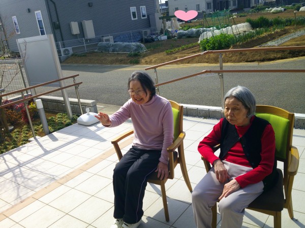 本日は、ぽかぽかと暖かく、風も穏やかだったので、入居者様と一緒に外気浴を楽しみました。