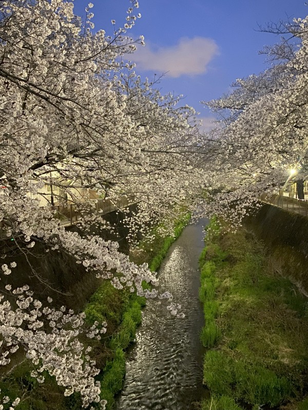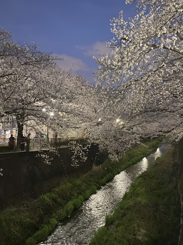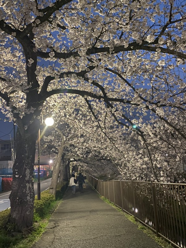 夜桜も昼間と違って素晴らしいです。桜を見上げながらライトアップされた歩道を歩いている方も多く、とても幻想的です。皆様もぜひ!!