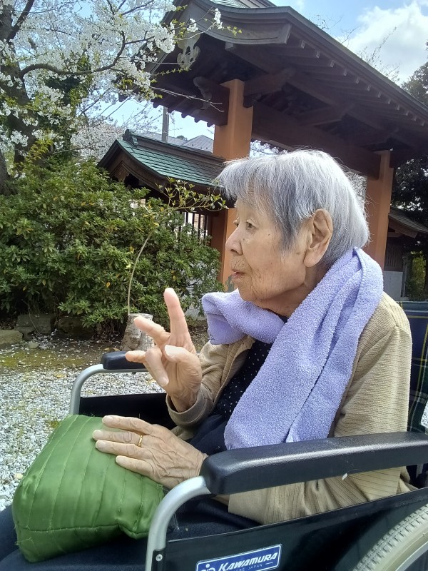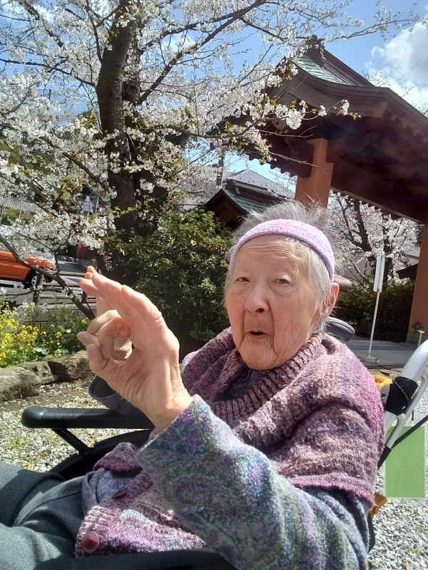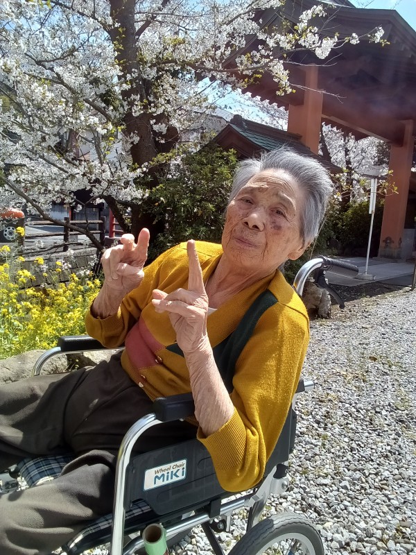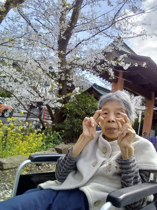 先日、ホームの前に咲いている桜の前で記念撮影をさせていただきました