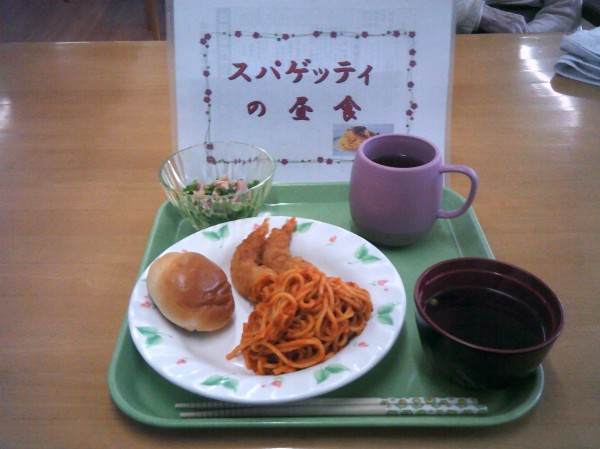 今日の昼食のメニューはナポリタンスパゲッティ・ロールパン・エビフライ????・サラダです( ^ω^)・・・