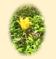 花の宴たけなわの春を迎え ホームの庭先には黄色のチューリップの花が咲き