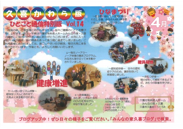 先月のホームの様子をギュッとまとめた「久喜かわら版 Vol.14」が出来上がりましたのでご覧ください。