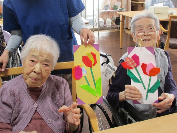 職員も一緒に作ってみましたが、簡単そうに見えて花びらをバランスよく貼るのが難しい(-_-;)画用紙からはみ出しすぎないように注意が必要です…!まさしく”脳と指を使う”レクになりそうです(`・ω・´)