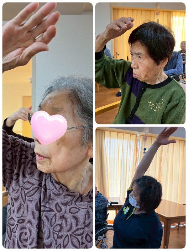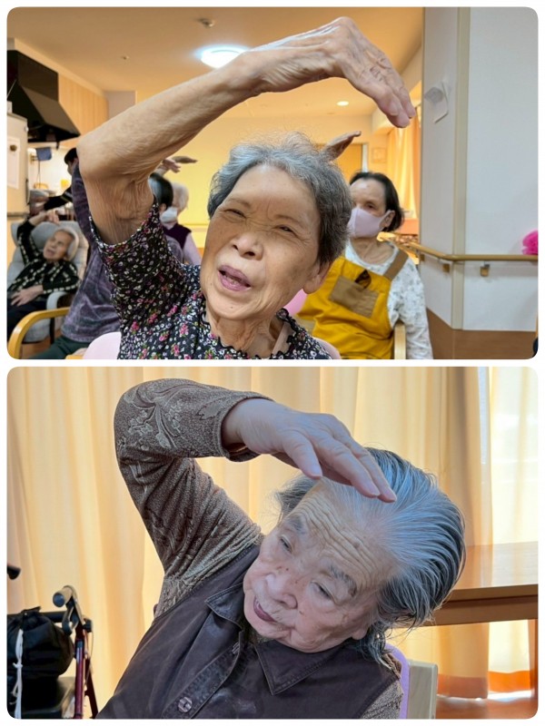 あちらでも、こちらでも、職員も!みんなで行う体操の時間。