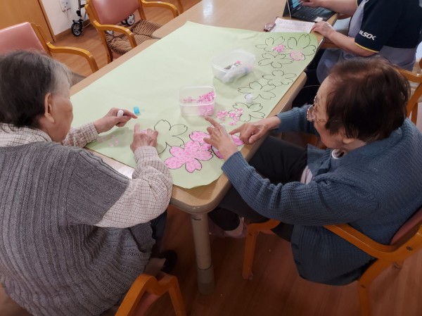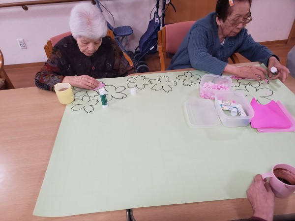 模造紙の上方に桜の花を描き、それにコツコツと命を入れて(ちぎり絵制作)