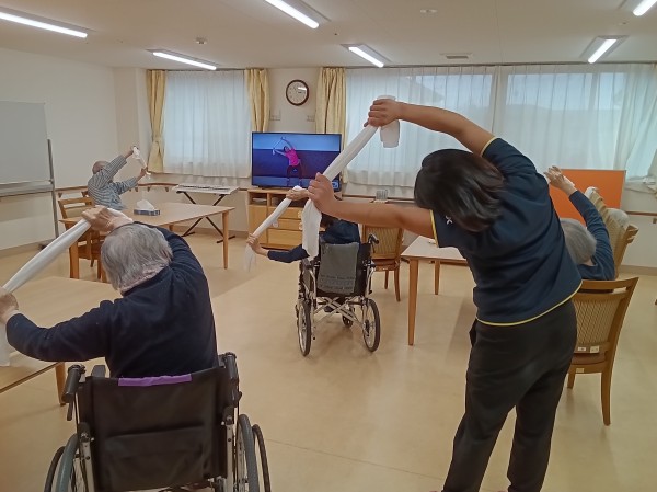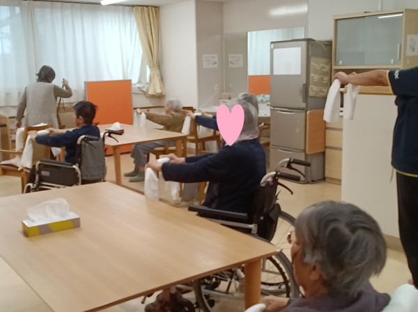 この日は、15時のおやつの前に、タオルを使って軽めの体操を行いました。