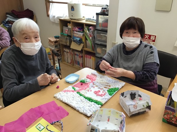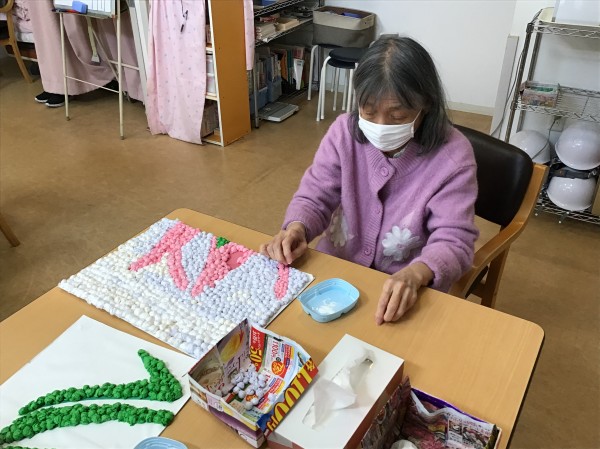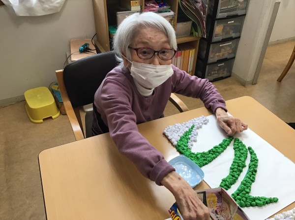 細かい作業をすることで指先のトレーニング…というだけではなく、季節の作品を作っていただき