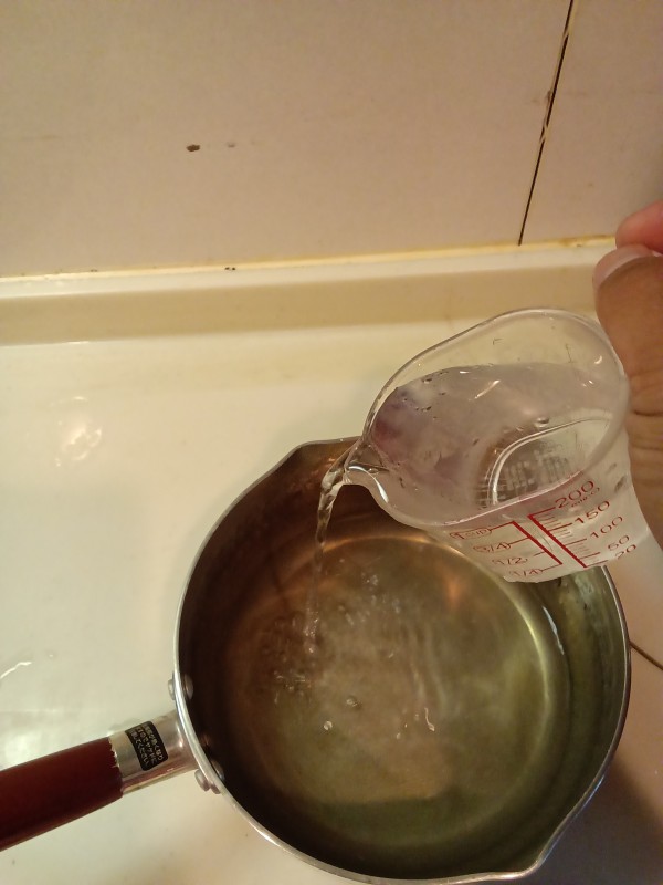 まずは水400ccに寒天8gを加え、そこへ更に砂糖130gを加えて1~2分ほど沸騰させます。