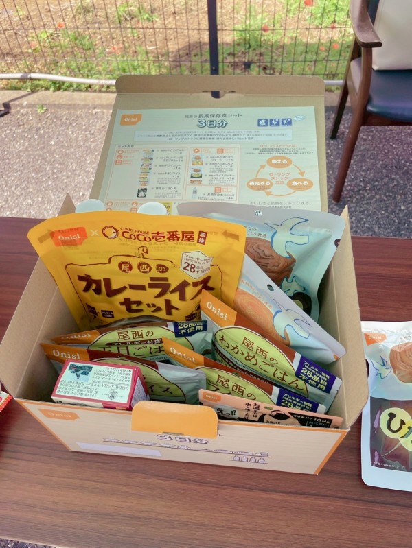 3日分の防災食としての箱の中身は、カレーやわかめごはん・アレルギー物質28品目不使用の五目ごはん