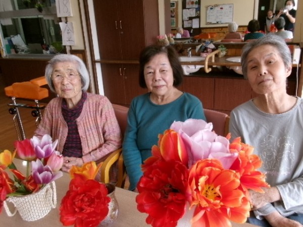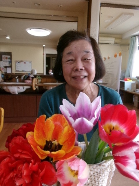 中庭で育てていたチューリップが咲き誇っていたので、ホールに飾ることにしました♪