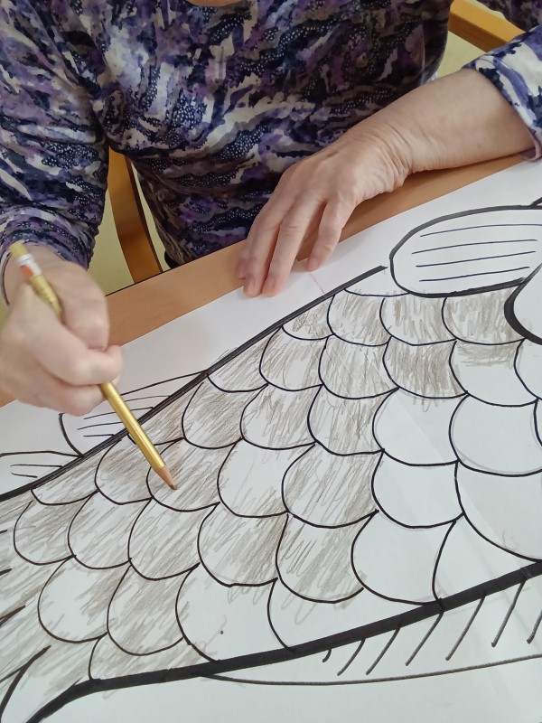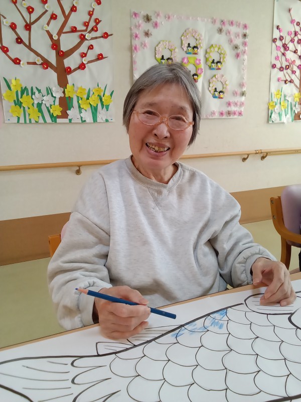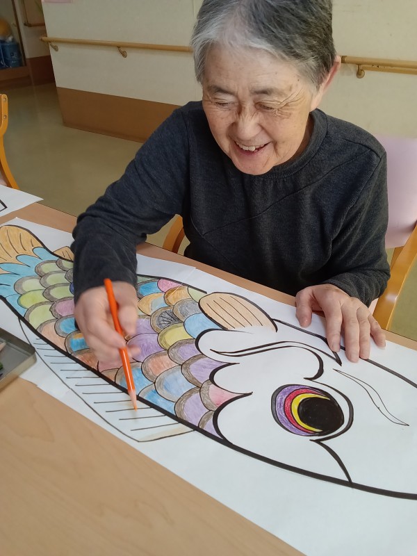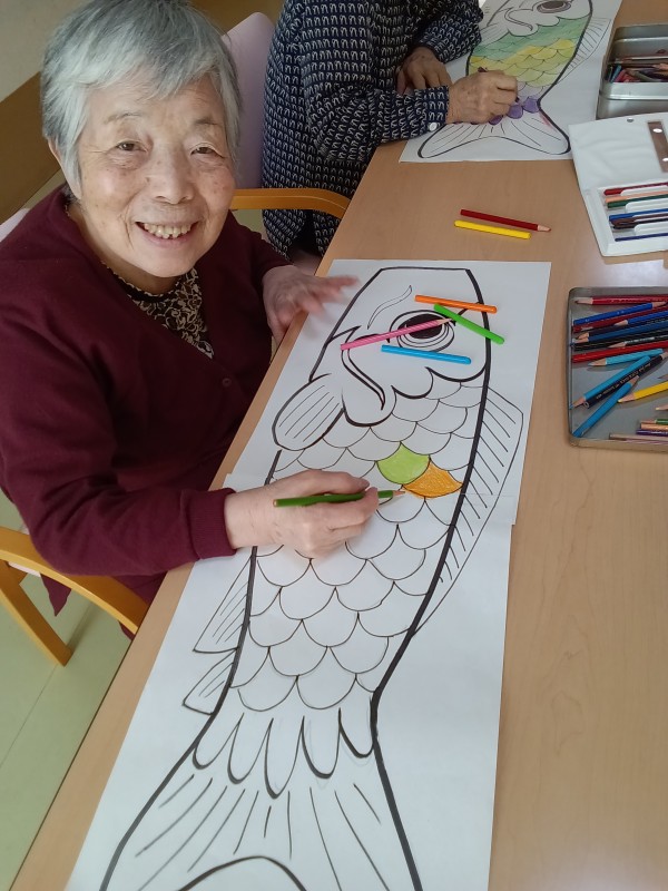 お一人1匹、鯉のぼりのイラストに思い思いの色を付ける作業、皆様無心になって取り組んでおられます