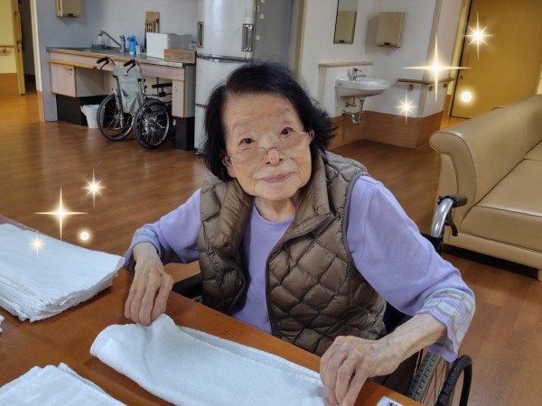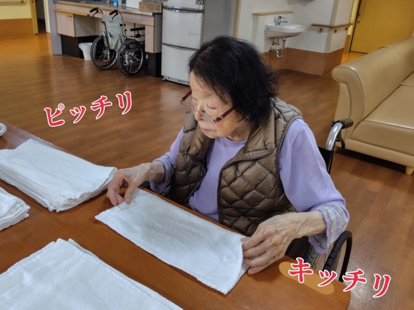こちらの奥様は、せっせとおしぼり畳み。クルクル巻く前のひと作業。