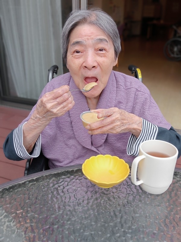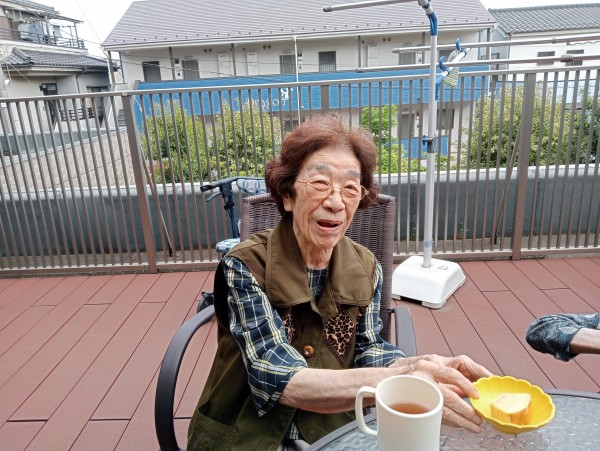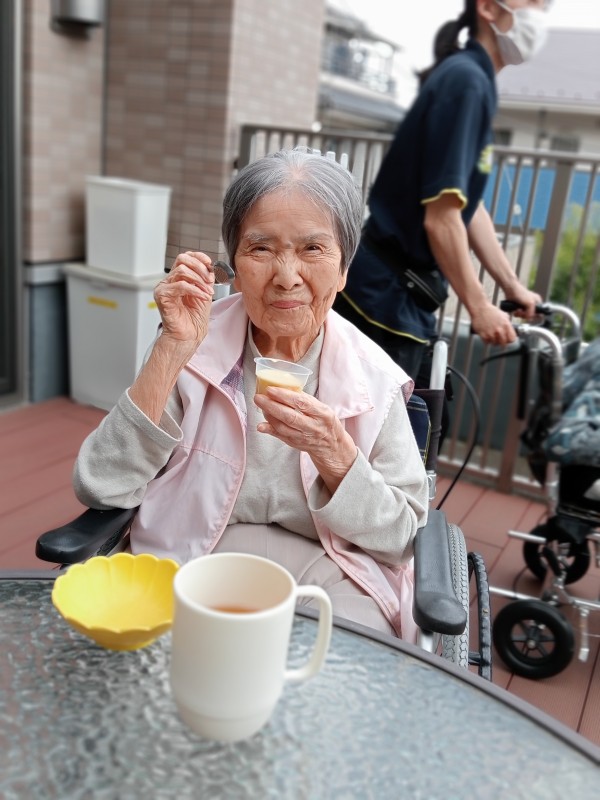 ですが、アミカの郷川口の皆様は元気にお過ごしです(´ω`*) 風が少しありましたが、テラスでおやつを召し上がっていただきました♡