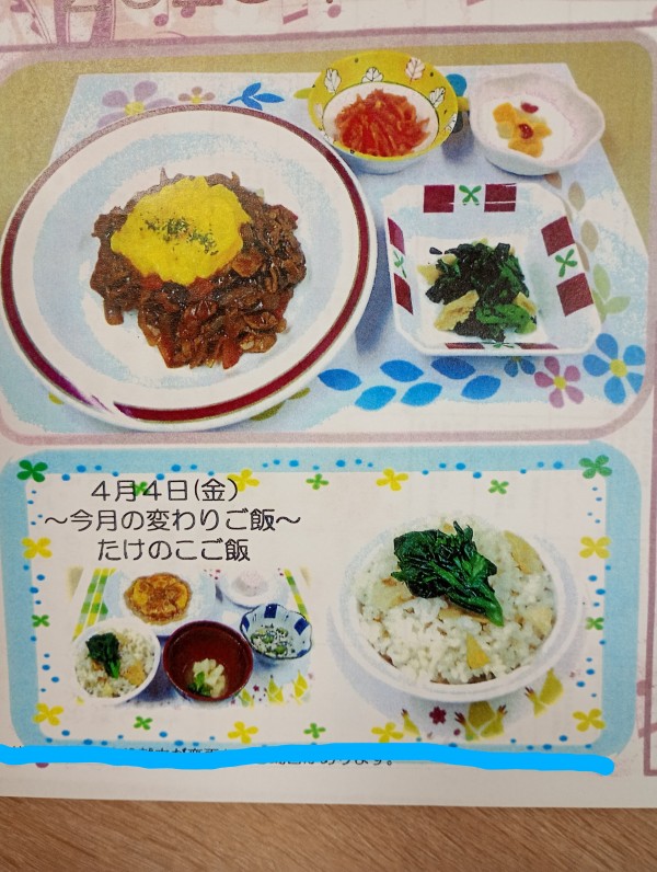 今回のブログは4月の特別献立をご紹介させていただきます。4月4日(金)と11日(金)の昼食はこのような特別メニューでした。