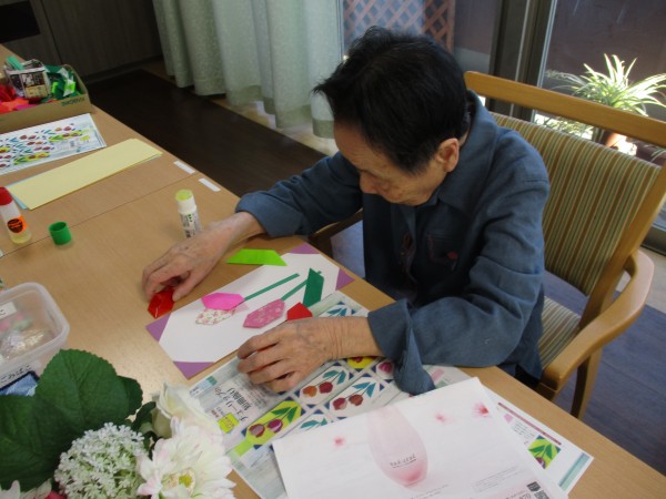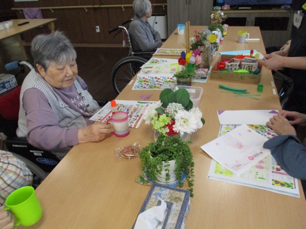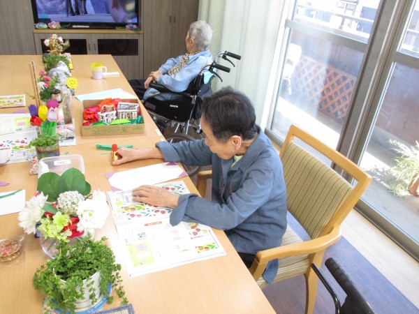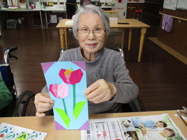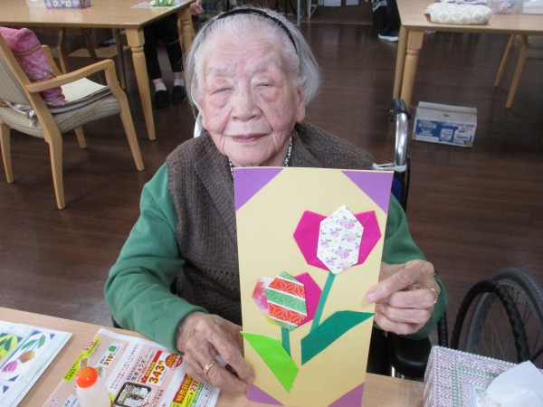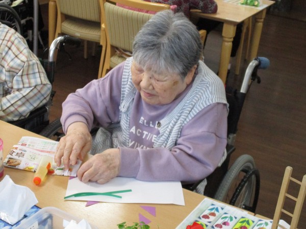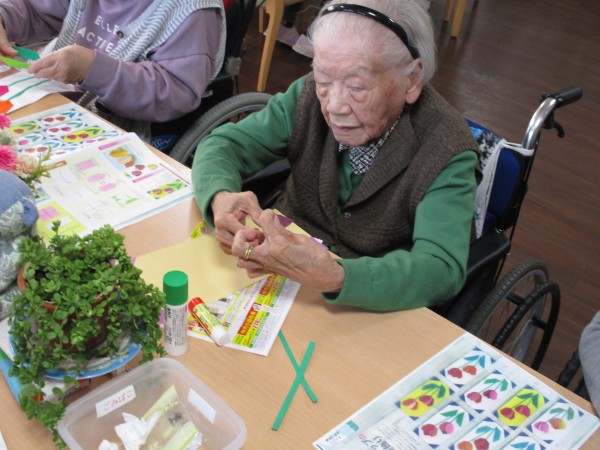 先日、3F、4F合同で「チューリップの短冊飾り制作」レクを行いましたが、本日は2Fの「チューリップの短冊飾り制作」レクの様子をお伝えします(^^♪