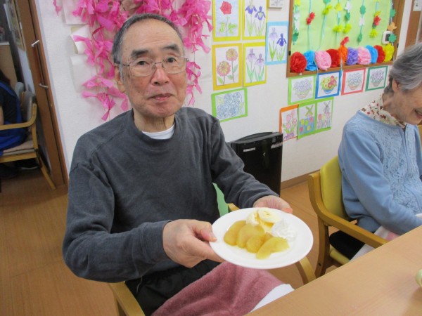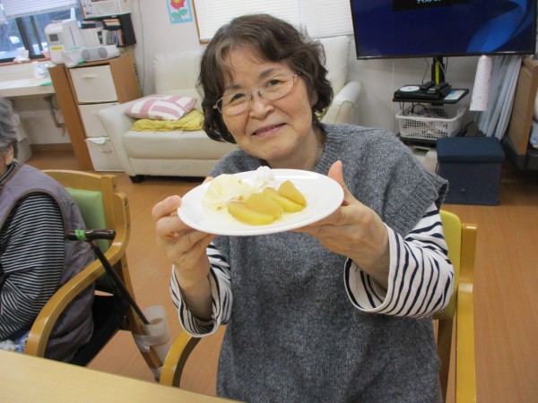 今日のおやつは、手作りの林檎コンポートでした。