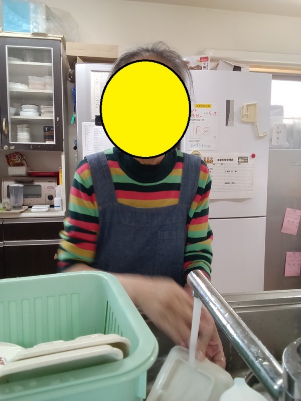エプロンして食器洗いされてます。物凄く良い笑顔!お見せ出来ないのが残念です(。▰´▵`▰。)