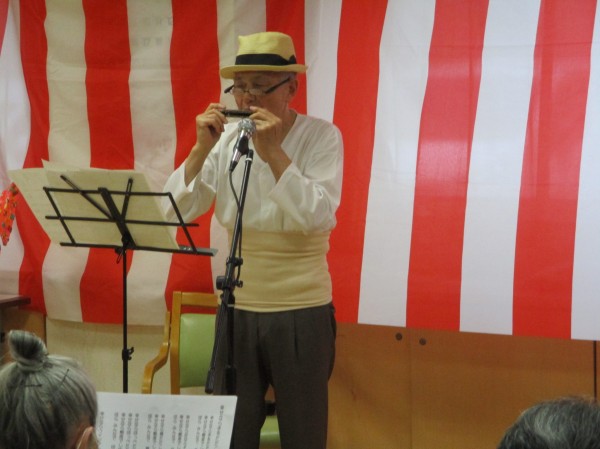 ハーモニカ演奏と音楽に合わせて利用者様も大合唱!