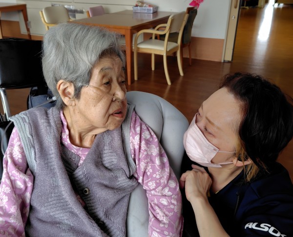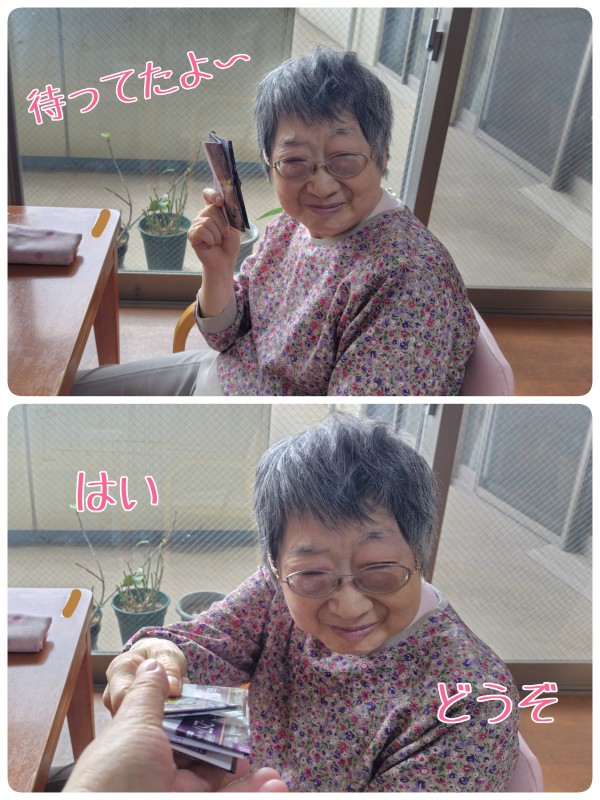 会うたびに『待ってたよ〜!』と、いつもの紙箱をプレゼントしてくださるご入居者様。これは◯◯さんの分、こっちは△△さんの分、とご準備してくださってます。