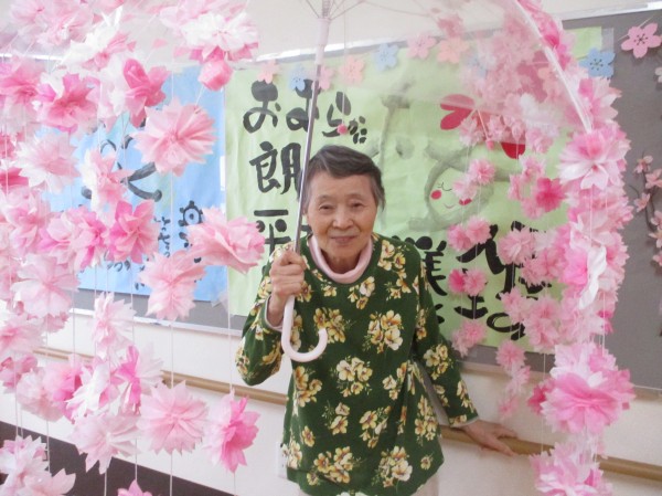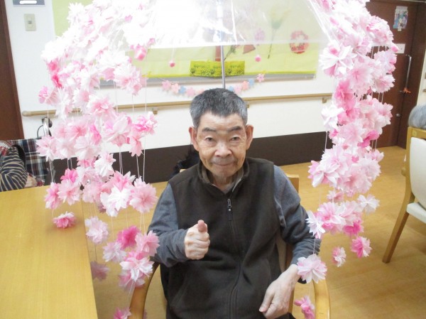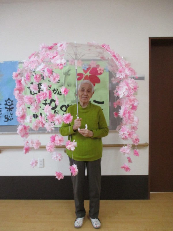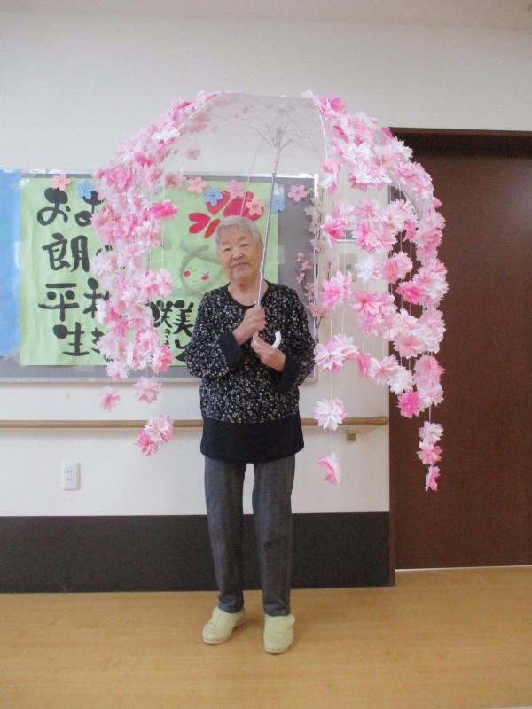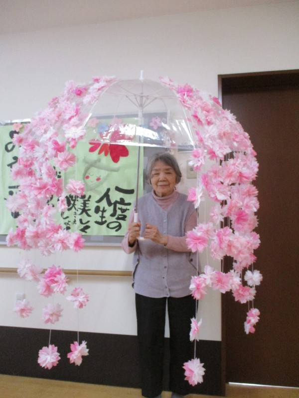 先月のブログに載せました、お花紙で作った桜を紐でつなげて、ビニール傘にくっ付けて……