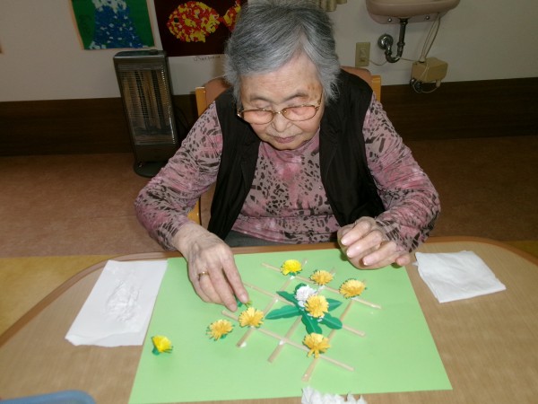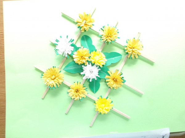 画用紙に割箸を貼り付け、葉・たんぽぽの花を