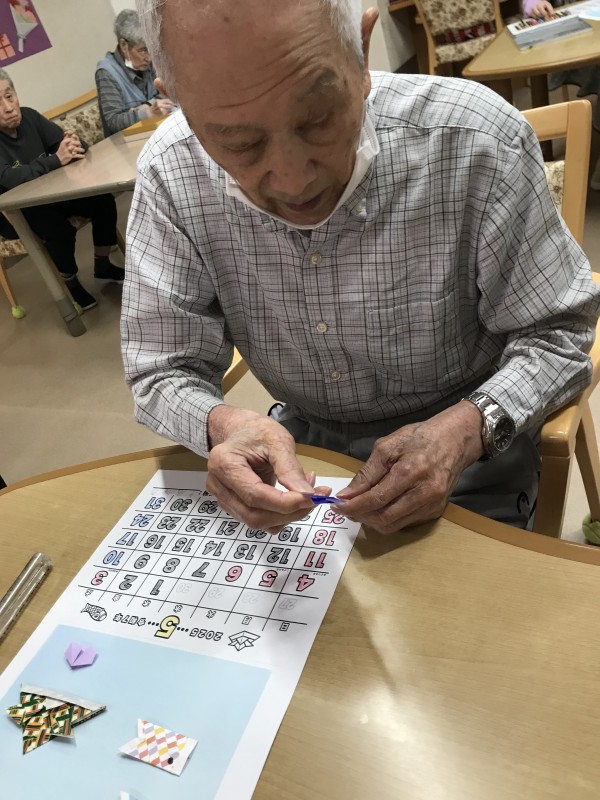男性は、兜に鯉のぼりを折り紙で作り、貼り付けてもらいました。