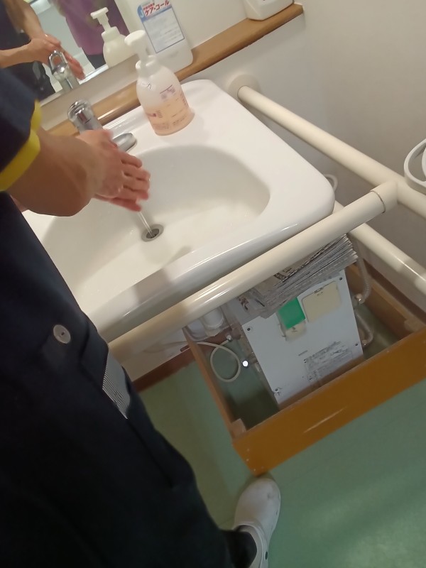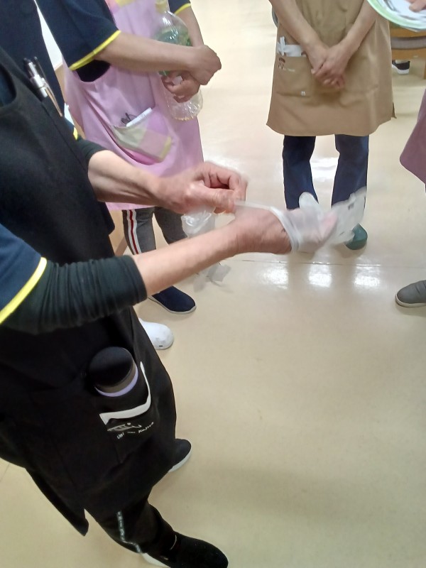 手袋の着脱 毎日介助をするたびに取り換え また新しい物を使い 一日何度も 手洗い 消毒 手袋の着脱を行います。改めて職員と確認