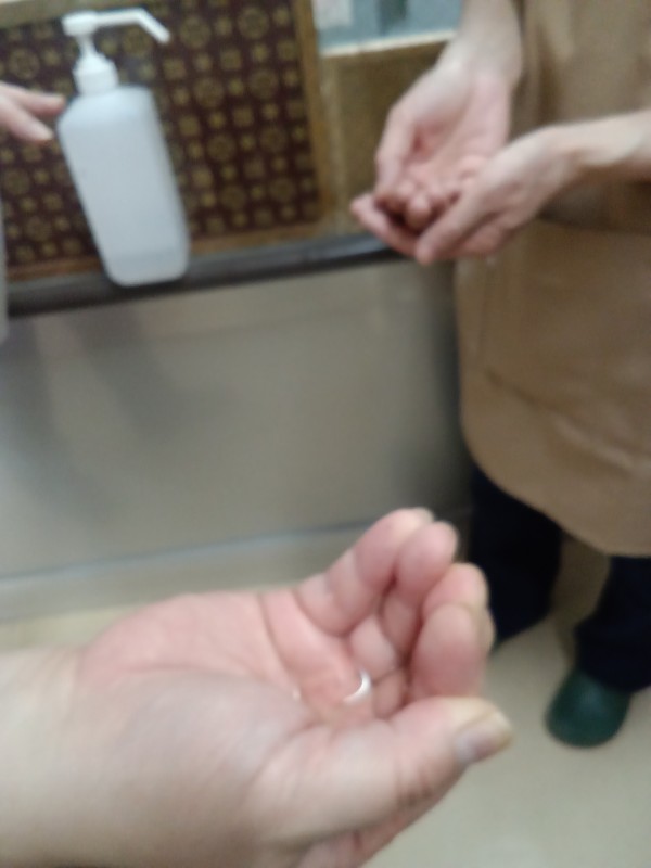 手の消毒 消毒の量 手袋の着脱 消毒の量は「結構いっぱいだね」「病院の自動消毒器から出て来る量は結構たっぷりだよね」改めて確認できました。