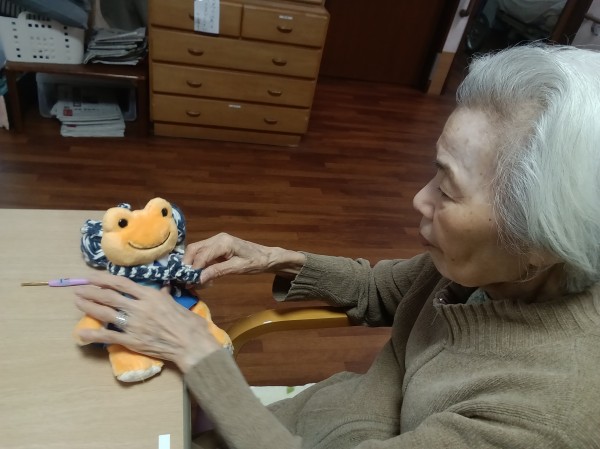 今回はご利用者様I様がカエルのピクルスあかりちゃんのために編み物をしていました。