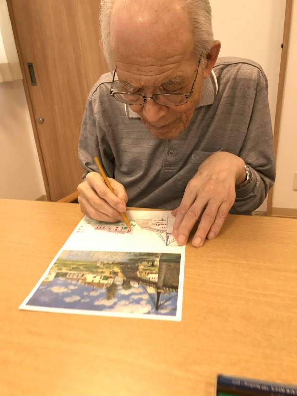 大人になってからこんなに面白い?集中することってなかなかないと思うのですが2階のみんなは塗り絵になるとすごい集中力です。これは模写バージョンなんですがそんなに色種類のない色鉛筆を使って一生懸命に塗り絵を作成していましたよ