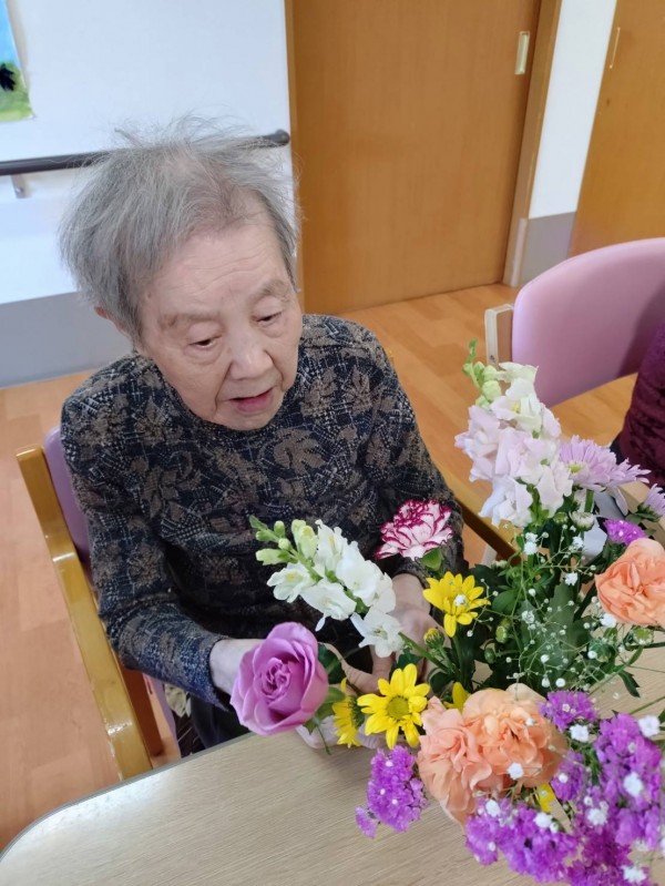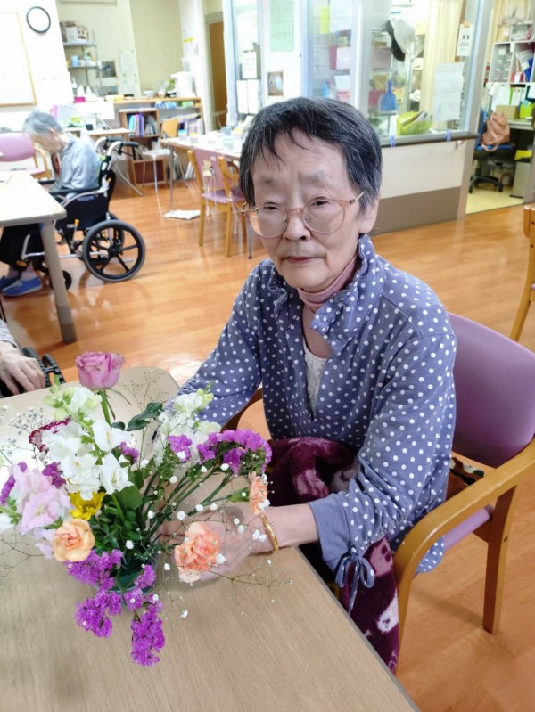 1階のデイサービスの利用者さんと共に…ピンクのバラやオレンジ色のカーネーションなどがあり、お部屋全体がとても華やかになりました。(5月になればあっという間に母の日ですね)