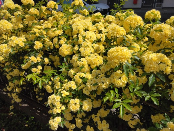 「アミカの郷流山」では、桜がすっかり葉桜となり、代わりにモッコウバラが満開に!