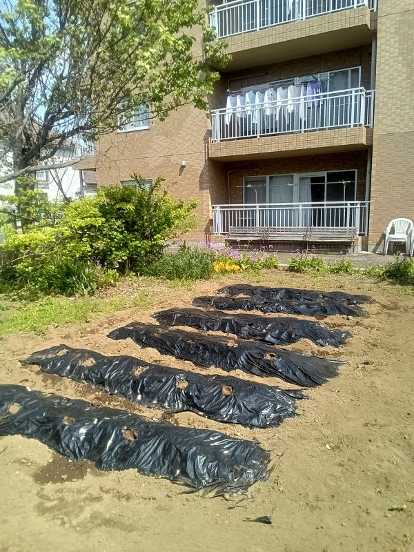 畑の土づくりは、牛ふん40kgを6袋、蒔き 土をまぜまぜしました。