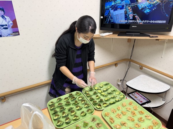 一人が切って一人が盛り付けて……。まさか厨房完備のデイサービスで料理をする事になるとは思いませんでしたが、だからこそとても楽しく準備させて頂きました(*^^)v