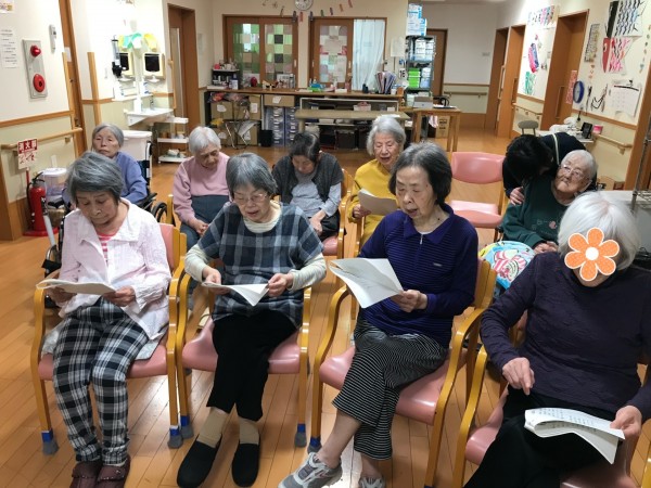 1階・2階のご利用者様が合同で集まり、歌詞カードを片手に全員で合唱。
