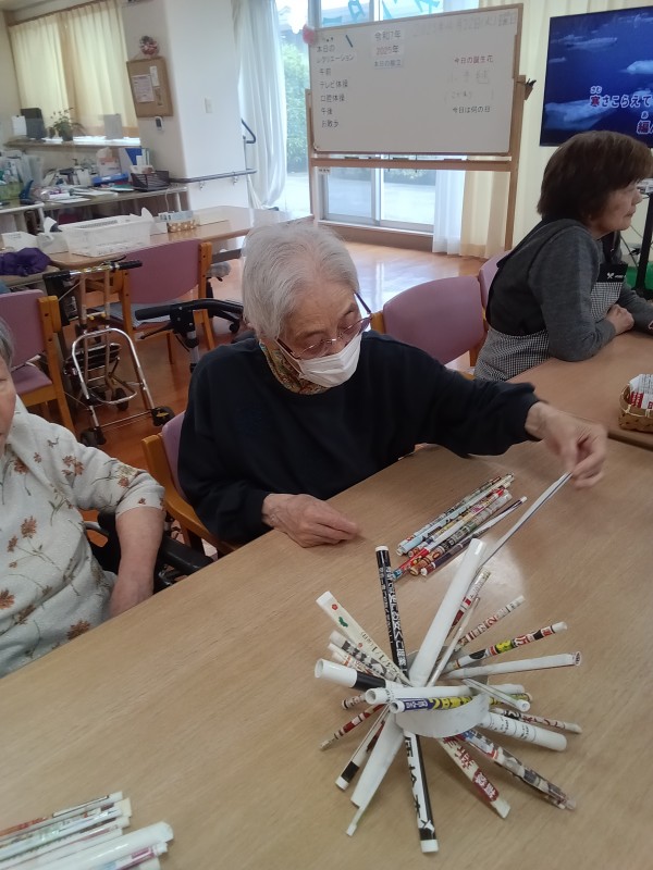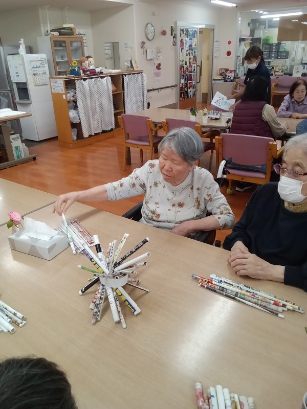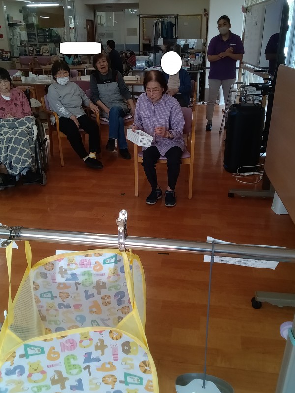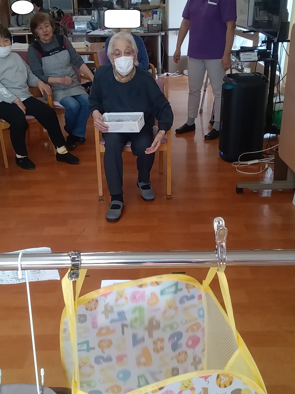 平行棒に色々入れ物をぶらさげて、そこにお手玉を投げ入れていきます。