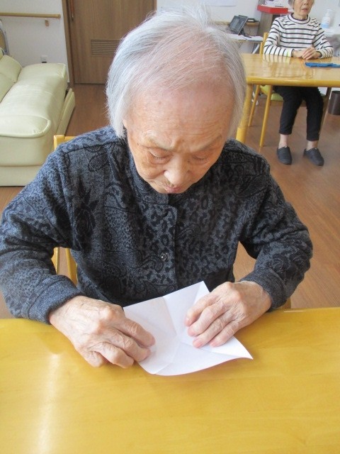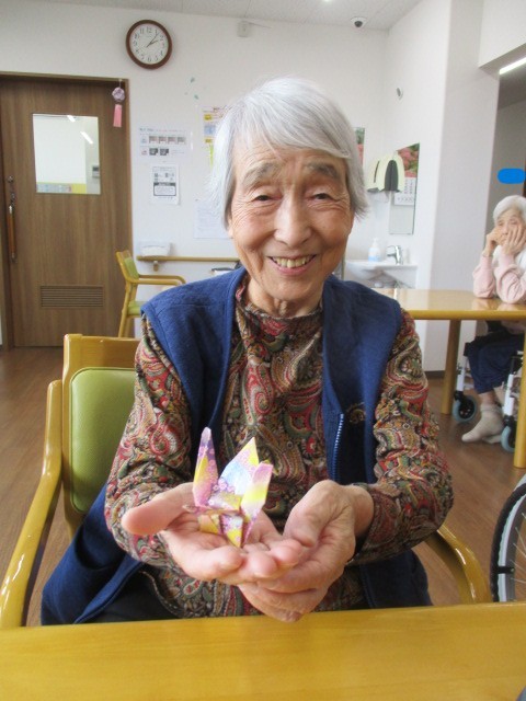 折り紙を行っています( ^ω^)・・・ 何ができるのかしら?? あら~ 鶴が出来上がりました。