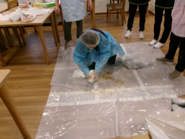今回は研修なので嘔吐物を想定し対応する際の装備品(ガウンやマスク他)の着用方法や処理の仕方、装備品を外す際の手順を実演しました!