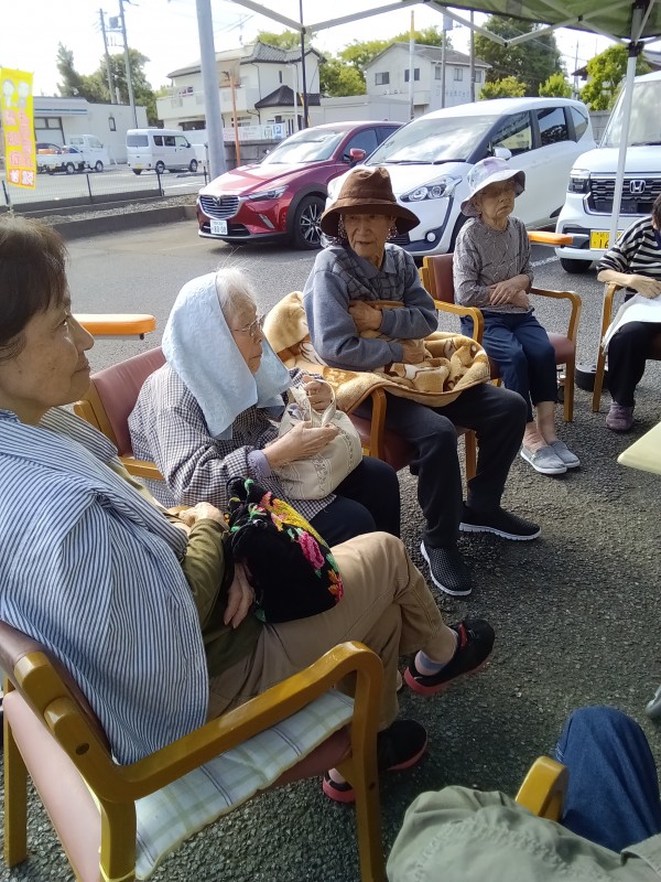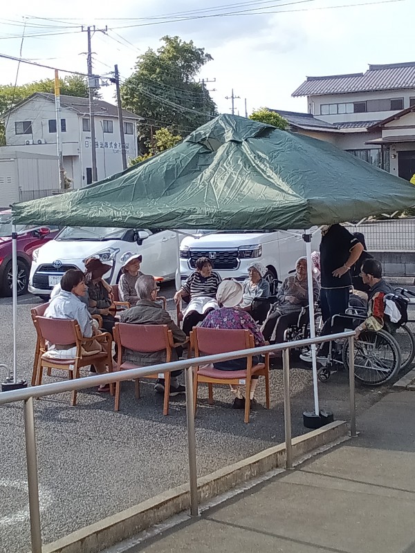 太陽の下で大きなテントを出して皆さんで食べるおやつは