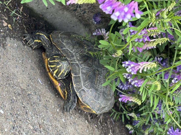 先日、花壇の水やりをしていたところ、亀がいました!!(笑)