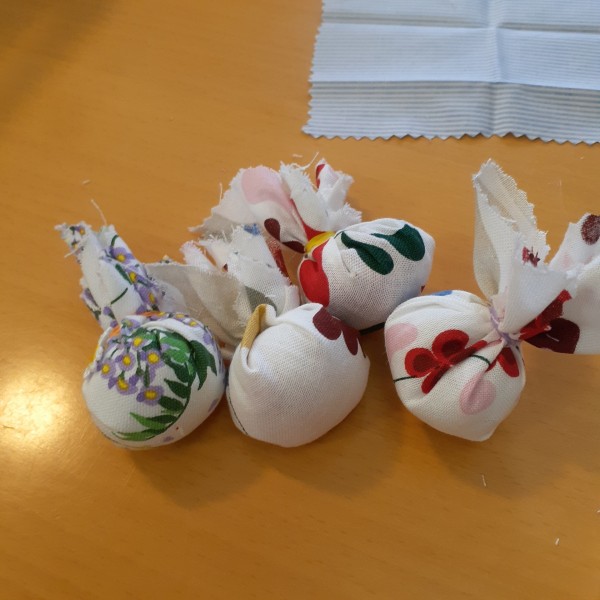 端切れ布を切り、丸めてゴムで縛って…、