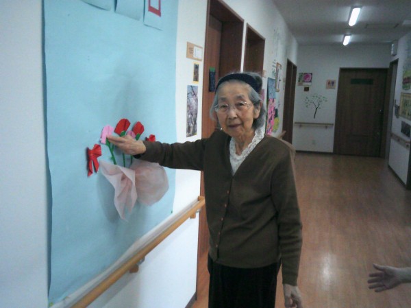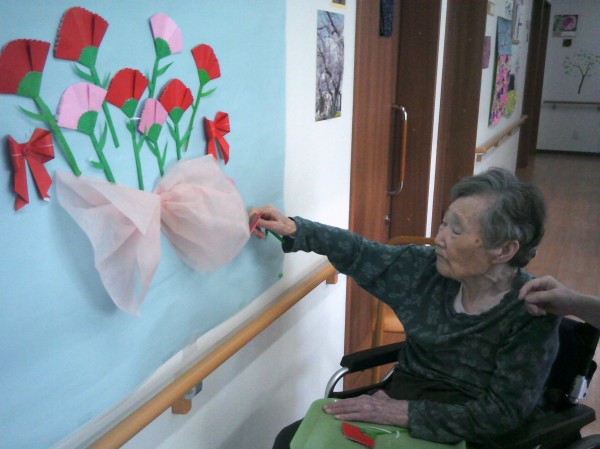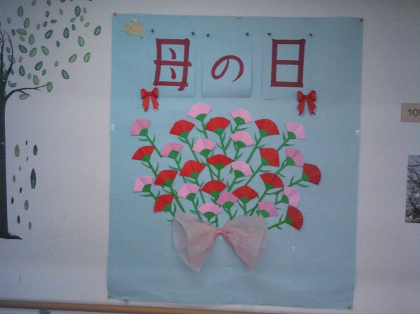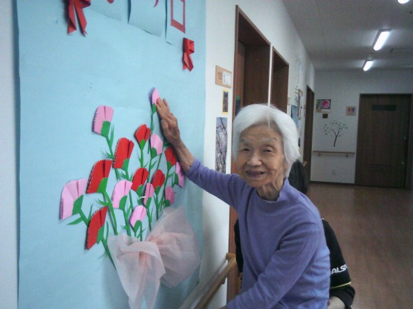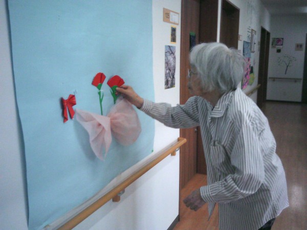 壁にカーネーションを貼っているご様子です( ^ω^)・・・ 立派に綺麗なカーネーションがたくさん飾れました(*^^)v