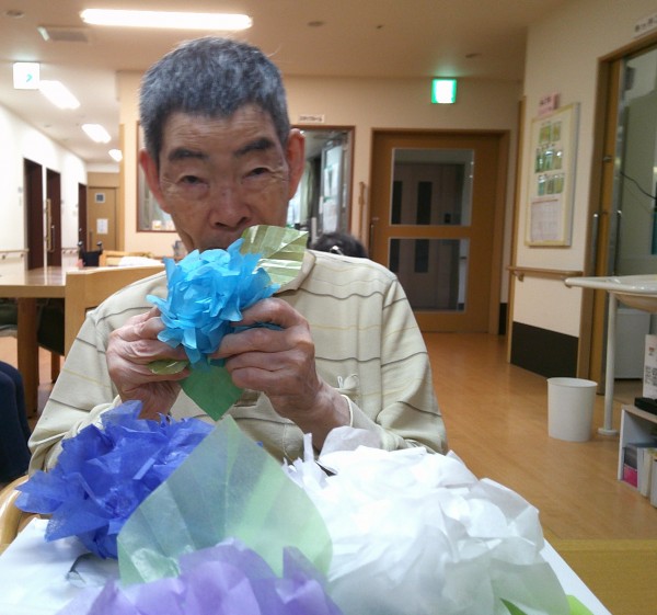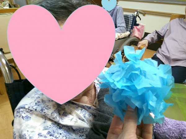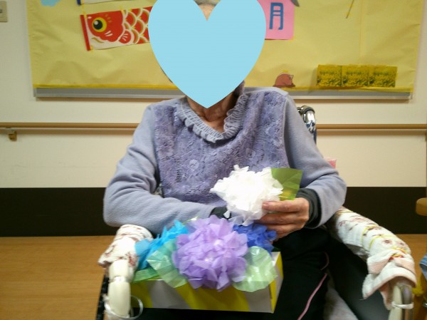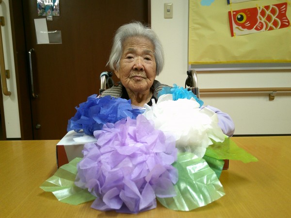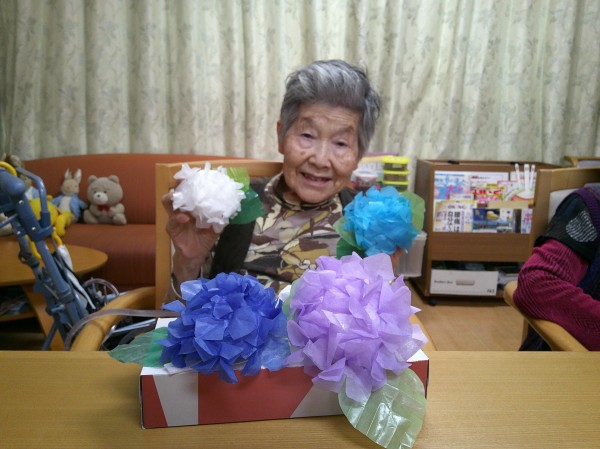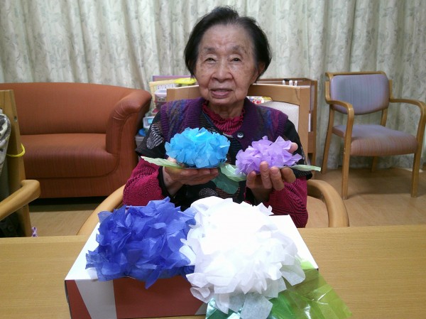 職員が用意したお花紙でアジサイの花を作っているとお聞きし、ぜひ2階の皆様にもみていただきたいと思い数個お借りしました☆彡