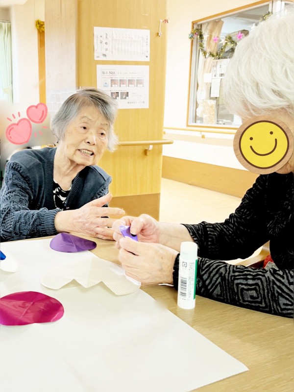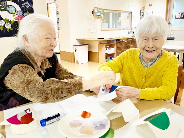 作業中は、入居者様同士で教え合いながら、和やかな時間が流れていました。「鱗の色が薄くて見えずらいから、難しくてできない。」と言っていたK様、隣でO様が出来ないのを見ると、ついついお世話好きの性格が出てしまい教えながら作り始めました!(笑)
