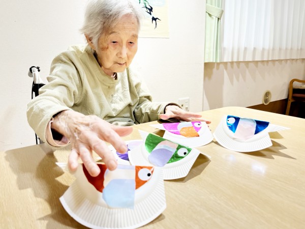 出来上がった鯉のぼりは、それぞれのお部屋に飾って楽しんでいただいております。季節を感じる作品作りを通して、交流と笑顔が生まれた素敵なひと時となりました。